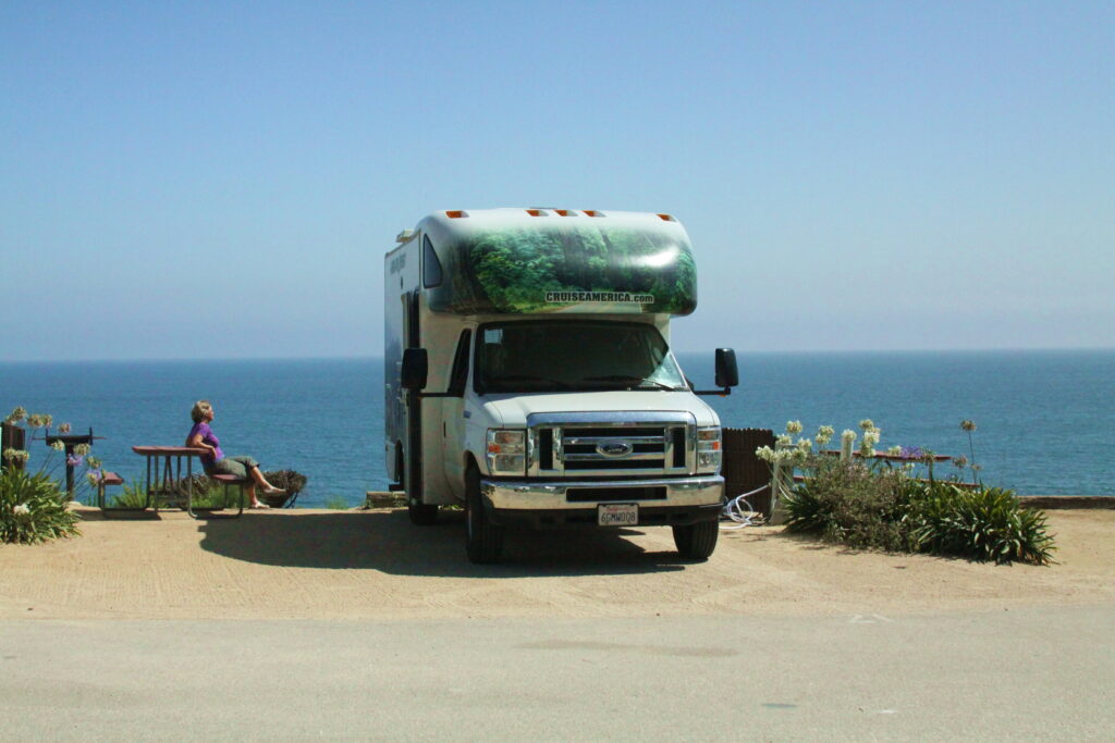 We pakken fotoboeken erbij. De prachtige Highway 1 van San Francisco naar Los Angeles. Een schitterende camping vlakbij de Palisades boven op een heuvel met uitzicht op de Pacific Ocean. Daar betaalden we extra voor, maar dat was het waard. De autoweg voor ons en de beboste heuvels achter ons. Onvergetelijke zonsopgang vanuit het achterraam van de camper. Het bos achter ons is nu weg.