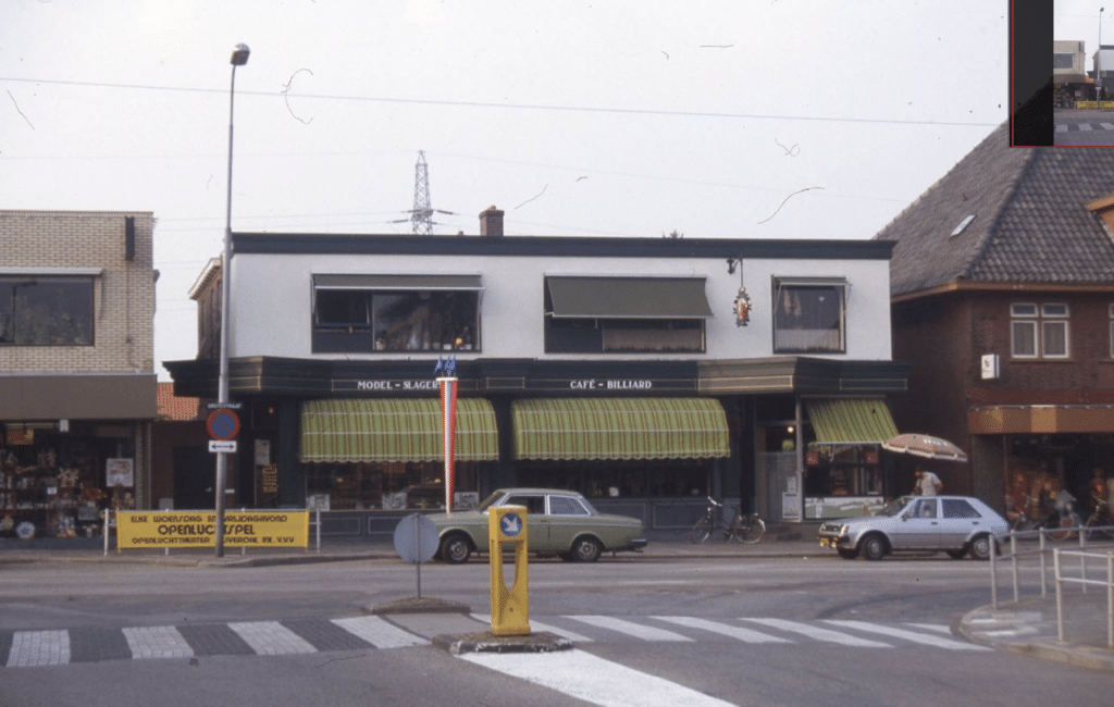 De foto hieronder laat zien dat de markante torens uit het verleden tijdens een sloop helaas werden verwijderd. De slagerij en café werden onderdeel van een nieuw klein appartementencomplex.