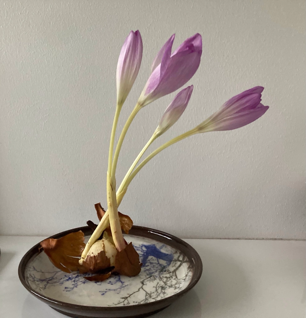 De naam herfsttijloos (tijdloos en niet stijlloos) betekent dat het plantje zich niet aan de seizoenen houdt: bladen en vruchten verschijnen in het voorjaar en de bloem in het najaar. Heel ongewoon. Ook lees ik dat het plantje uitermate giftig is. Het zit vol met colchicine*. En dat kun je beter niet binnen krijgen. Daar staat tegenover dat het in de homeopathie net als in de oudheid aangeraden wordt als middel (thee en tabletten) tegen jicht.