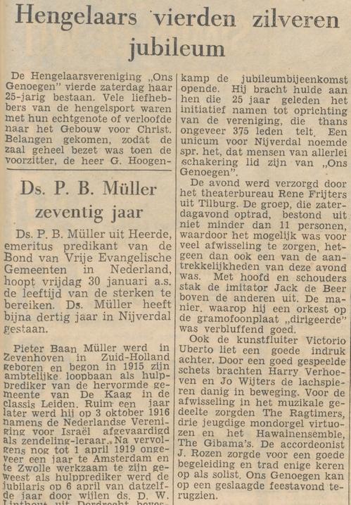In januari 1959 vierde Ons Genoegen het zilveren jubileum (een jaar te vroeg. Waarom is onduidelijk). De grote zaal van het Gebouw voor Christelijke belangen zat helemaal vol toen voorzitter Hoogekamp de bijenkomst opende en de leden huldigde die 25 jaar eerder de club oprichtten.