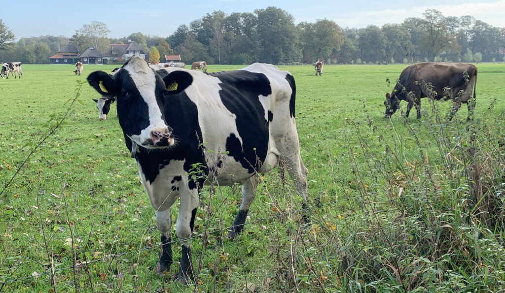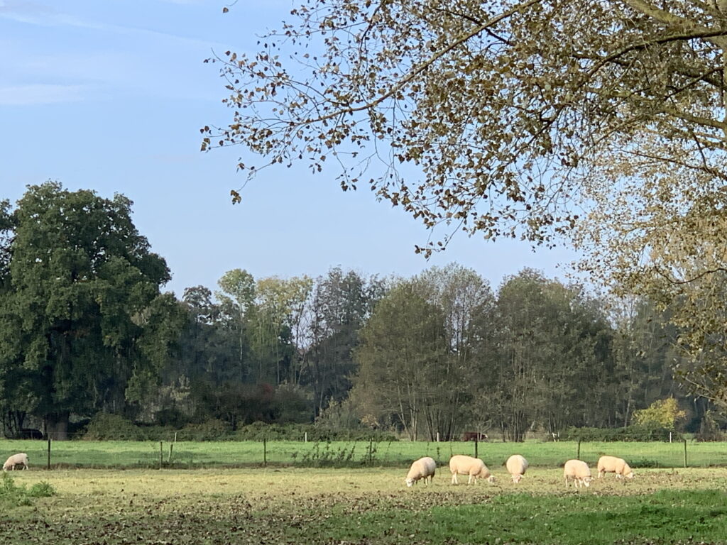 Windstil weer. Na een paar sluiers in de morgen een stralende dag. De thermometer geeft 19 graden aan, maar het voelt veel warmer. De jas kan snel uit. Op het land mogen de koeien de laatste restjes gras eten voor de winterstal wacht. Schapen doen vrolijk mee. De mais wacht op de oogst.