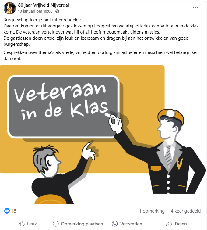 Behalve het ondersteunen van culturele initiatieven is Nathalie ook druk met het maken van bijdragen voor de Facebookpagina 80 jaar Vrijheid Nijverdal. Met grote regelmaat verschijnen daarop stukjes van het programma met een toelichting. Geschreven met zoveel enthousiasme, dat je direct zin krijgt er naar toe te gaan straks van 1 tot en met 5 mei.