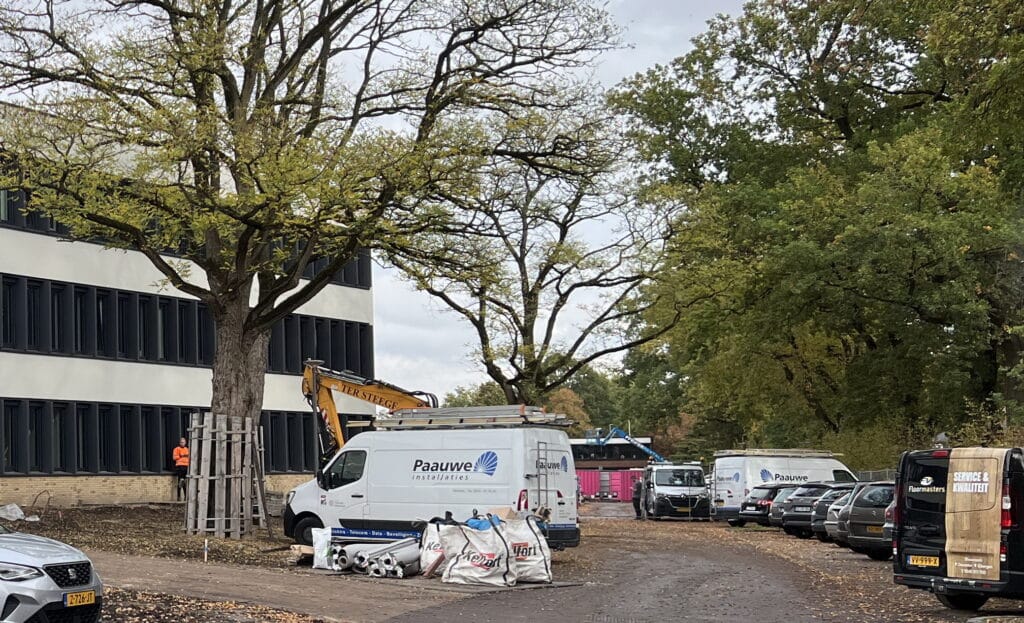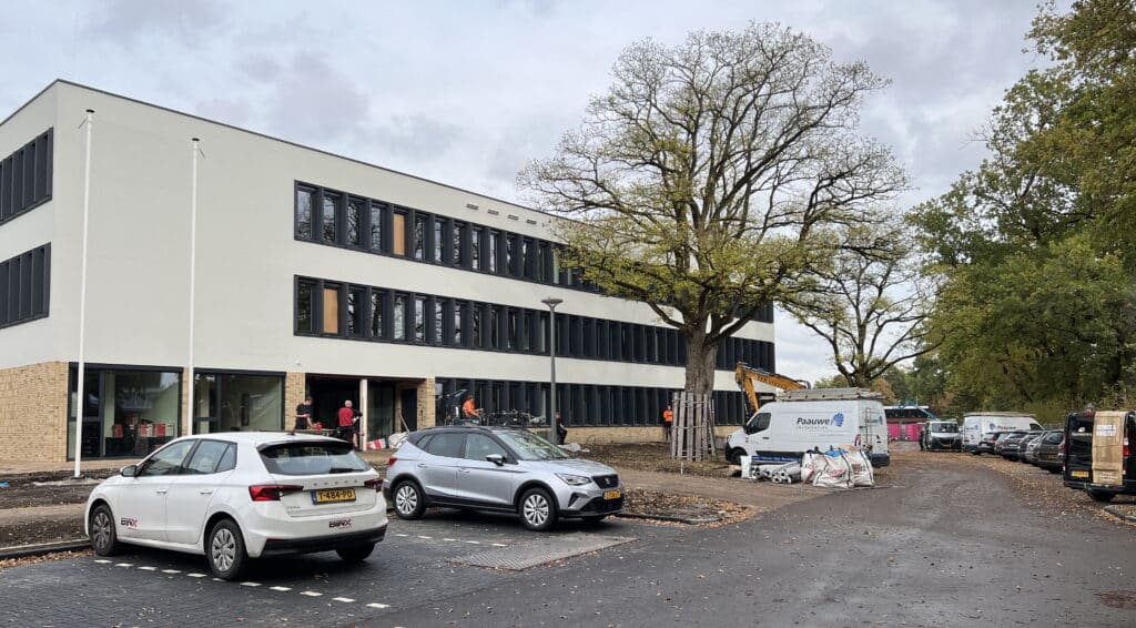 Hun fiets parkeren gaat in ieder geval lukken. De rekken staan te glimmen in de najaarszon. Binnen en buiten is het nog een drukte van jewelste. Vloerenleggers en afbouwers zijn nog volop aan het werk. Buiten staan nog graafmachines.