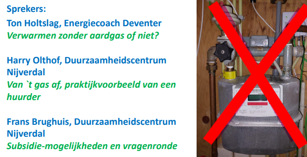 Tijdens deze bijeenkomst gaat een aantal inleiders aan de hand van praktijkvoorbeelden in op hoe we ons huis in de toekomst kunnen of moeten gaan verwarmen. Is aardgas nog steeds een optie of zullen we op een andere manier onze woningen moeten gaan verwarmen? En wat zijn dan de (on)mogelijkheden?