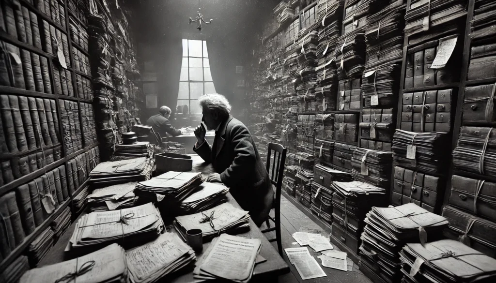In een speciale leesruimte lagen alle opgevraagde documenten voor me klaar. Aantekeningen, krantenknipsels, processenverbaal, verslagen, alles in oude mappen en bijeen gehouden door smoezelige linten. Helemaal in de hoek van het zaaltje zat een gezette man met wild, grijs haar. Hij groette me zonder zich om te draaien. Ik begon: verbaal na verbaal, verslag na verslag. Zonder ophouden fluisterde ik alle teksten in mijn mouw. Steeds vlugger en ook steeds harder.