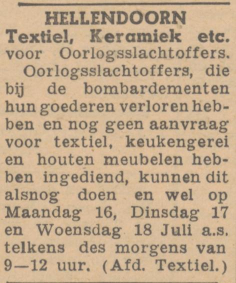 De bombardementen in Nijverdal hebben veel mensen dakloos gemaakt. Ook zijn ze hun spullen kwijt. Je kunt je bij de gemeente aanmelden voor nieuw spul. Wie nog geen aanvraag heeft gedaan voor textiel, keukengerei en houten meubelen krijgen in juli 1945 nog een tweede kans dat te doen.