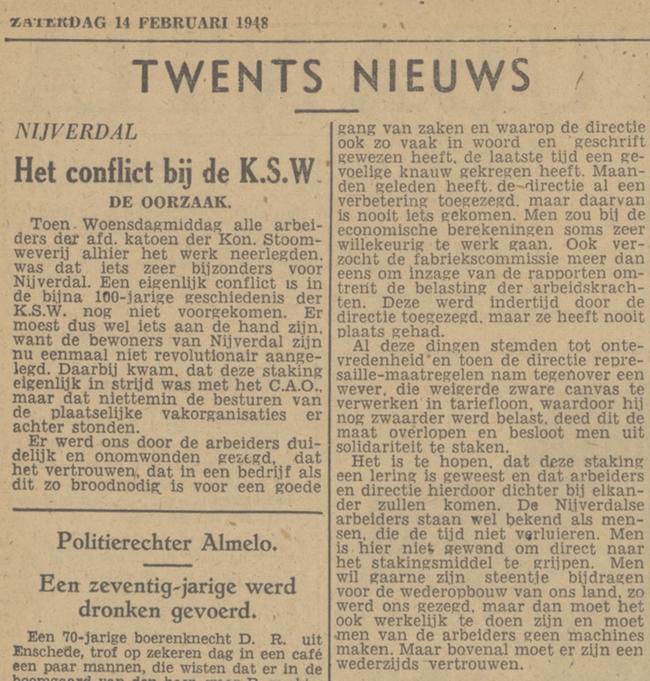 Begin februari 1948 is er een staking van de arbeiders van de KSW. Bijzonder, omdat daar nauwelijks stakingen zijn. De arbeiders en de fabrikanten hebben het altijd goed met elkaar kunnen vinden. Maar nu even niet. De mensen klagen al een tijdje dat het werk te zwaar is en het loon te laag. De directie belooft beterschap , maar reageert niet.