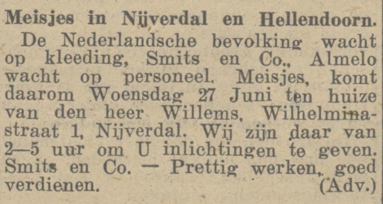 Meisjes in Nijverdal en Hellendoorn lezen in de krant een advertentie van Smits en Co uit Almelo waarin zij worden opgeroepen te komen werken in de kledingindustrie. Wie belangstelling heeft kan op 27 juni terecht ten huize van de heer Willems aan de Wilhelminastraat in Nijverdal. Daar zijn inlichtingen te krijgen over het werken bij dit bedrijf. “Prettig werken. Goed verdienen.”