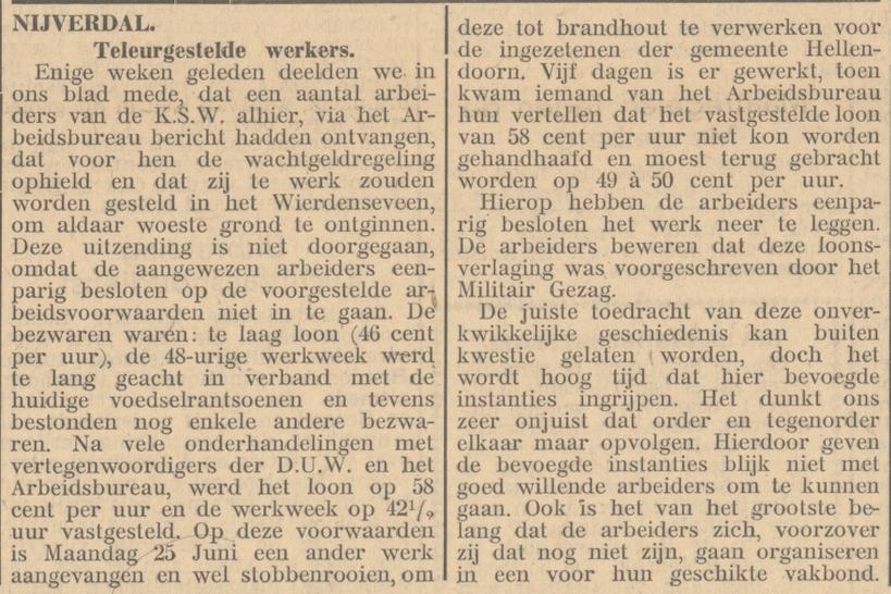 Omdat de KSW nog niet open kan (er zijn geen grondstoffen), krijgen de arbeiders een wachtgeldregeling. Dat duurt niet lang, want al gauw bedenkt men dat ze voor dat (wacht)geld ook wel werk kunnen doen. De arbeiders krijgen een oproep voor tewerkstelling. Ontginnen van het Wierdenseveld.