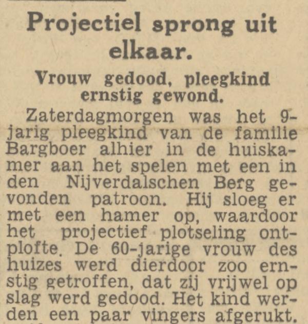 Een maand later verschijnt er een mededeling van de burgemeester, die waarschuwt voor boobytraps in de vorm van jachtpatronen, achtergelaten door het Duitse leger. Het afschieten van zo’n patroon met een jachtgeweer doet het geweer ontploffen is is dus levensgevaarlijk voor de schutter.