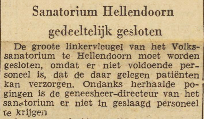 Men vraagt zelfs het Rode Kruis om hulp. “Deze voor onze samenleving zoo belangrijke inrichting -er worden op dit moment 300 tbc-patiënten verpleegd- heeft nl een groot personeelsgebrek.“ Het grote aantal patiënten komt ook, omdat veel mensen die terugkeren uit Duitsland (gevangenschap en Arbeitseinsatz) aan tbc lijden.